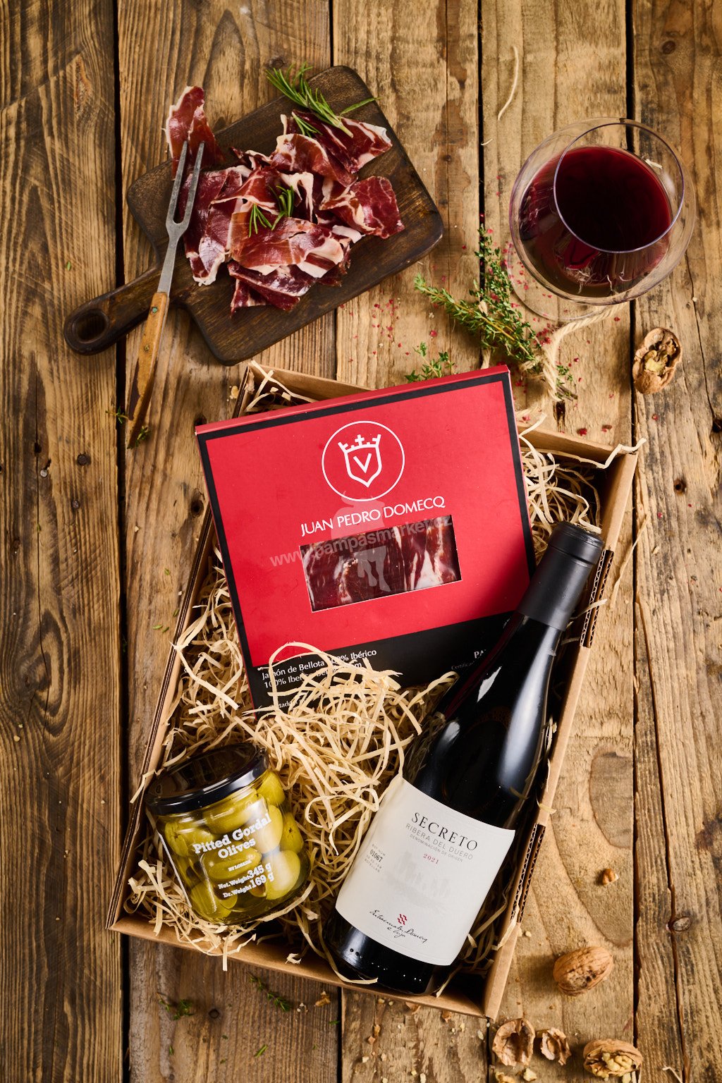 Darujte exkluzivní gurmánský zážitek - se sušenou šunkou Ibérico 100 % Bellota nejvyšší kvality z volně pasoucích se iberských prasat krmených výhradně žaludy, španělským vínem Secreto Tempranillo z renomované oblasti Ribera del Duero a velkými olivami Gordal z farmy Losada. Každý plátek šunky nabízí jemnou mramorovanost, intenzivní aroma a máslovou chuť, která se rozplývá na jazyku. Víno a olivy dokonale doplňují delikátní španělské speciality a vytvářejí skvělý gurmánský zážitek.