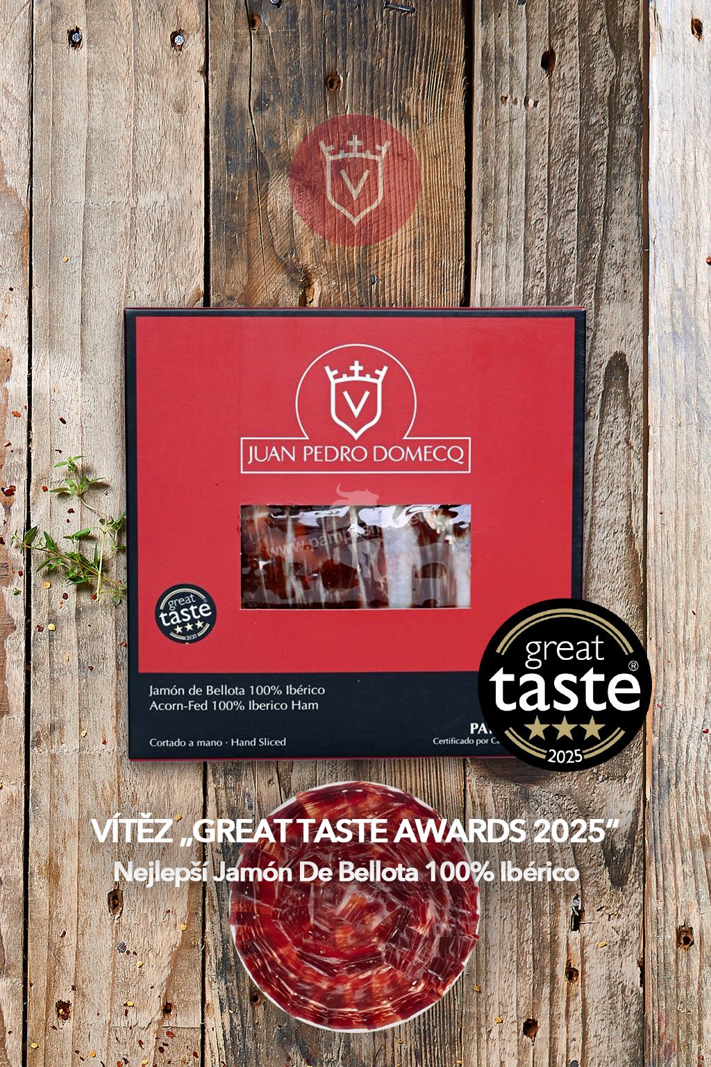 Věhlasná rodina Juan Pedro Domecq, držitel 3 zlatých hvězd Great Taste Awards 2025 a šestinásobný vítěz ocenění za nejlepší 100% iberskou šunku z volného chovu, je již přes 40 let garancí kvality, poctivého zrání a jedinečné chuti.