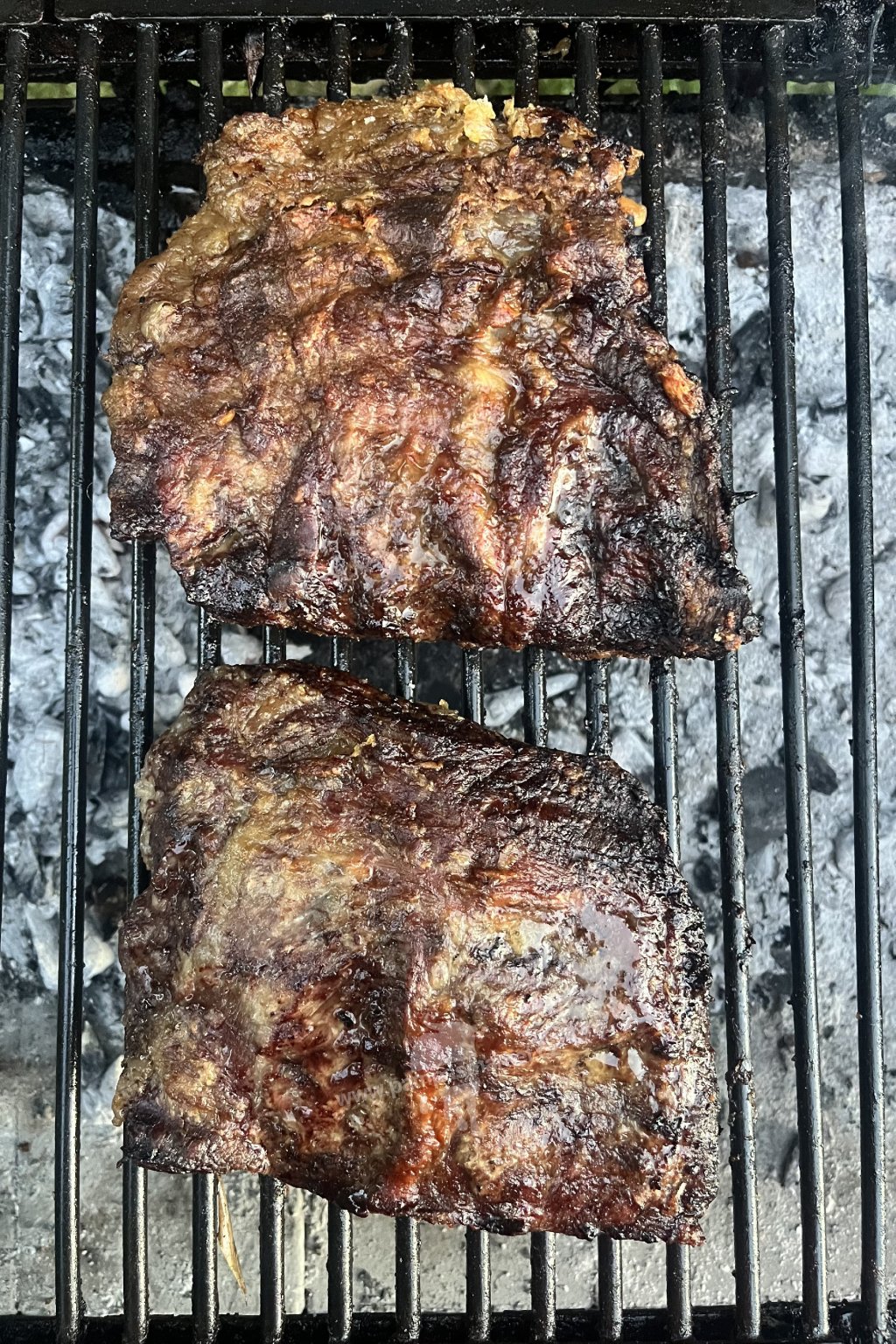 Nad přímým žárem ohně na grilu opečte 5 minut z každé strany. Po té pokračujte pomalým grilováním další 4 a 1/2 hodiny na nepřímé zóně pouze na rozžhaveném uhlí (uhlíky mají bílou popelavou barvu).